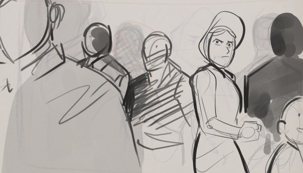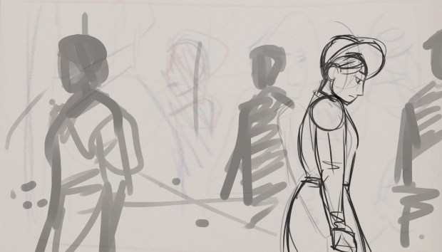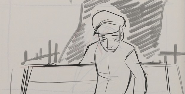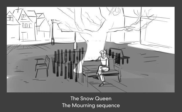 Just like in the original tale, the Snow Queen kidnaps Kai, the little boy. Soon after, Gerda, his best friend and neighbor runs away from home, so she can bring him back safely. This scene takes after all those events as we see the two protagonist’s parents dealing with grief, since they both assume their children are dead. Despite his sorrow, Kai’s father tries initaing contact with Gerda’s mother, so maybe they can deal with the situation together, but Gerda’s mother upholds a reclusive behavior.