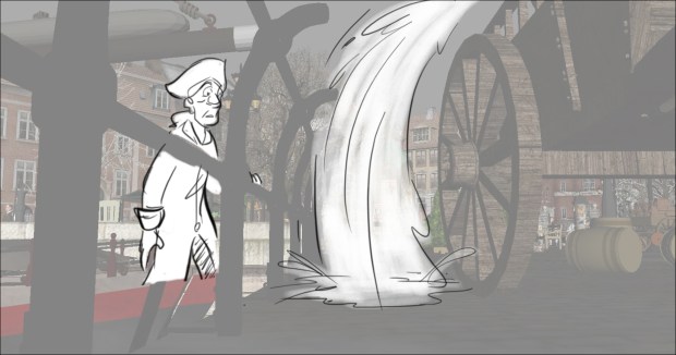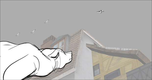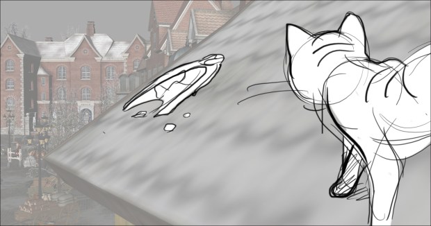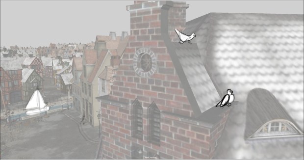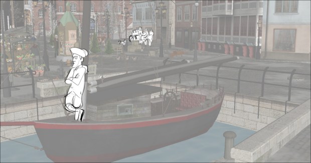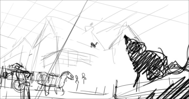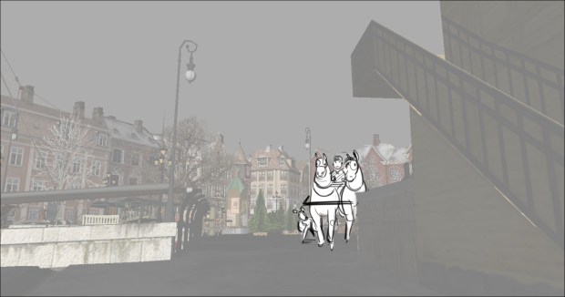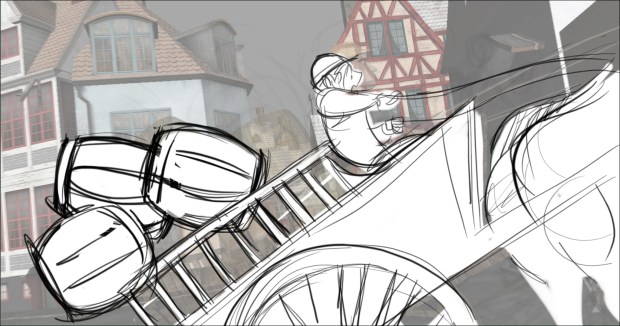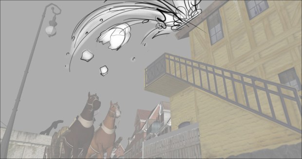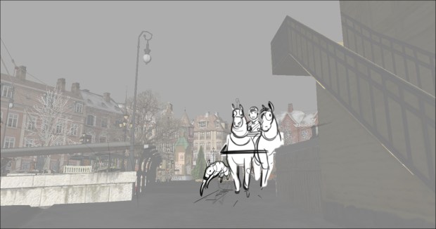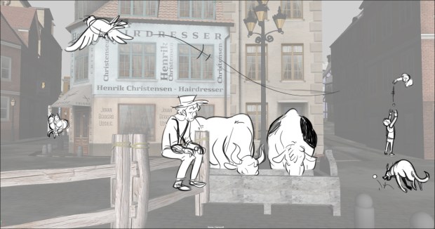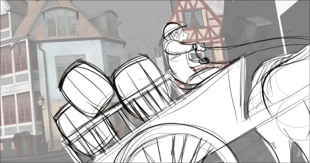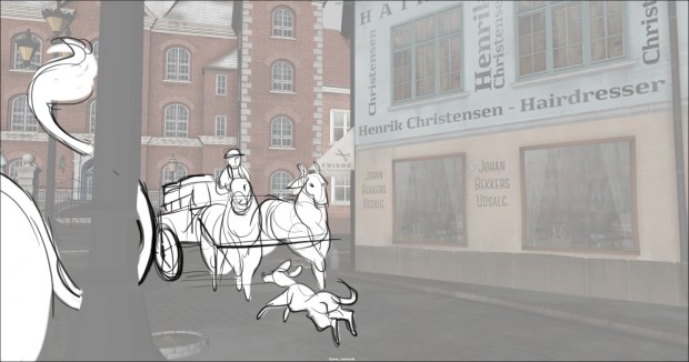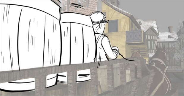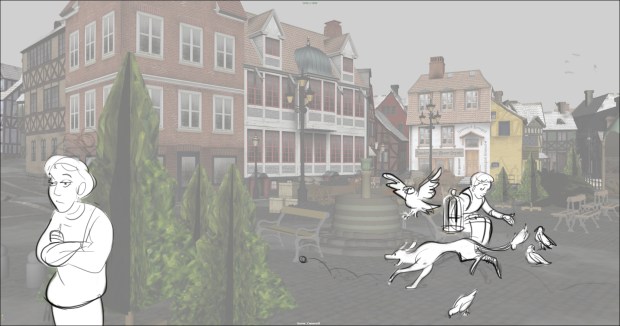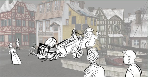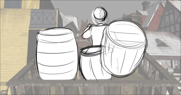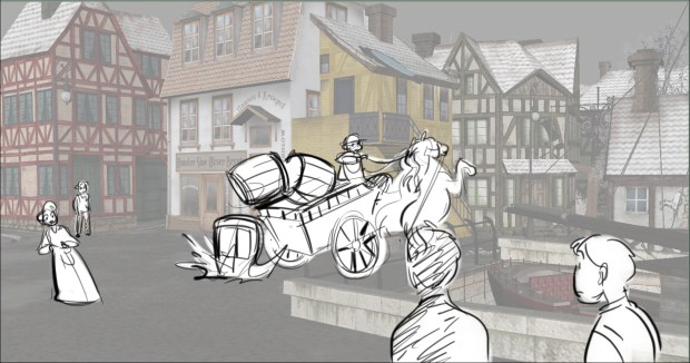 In this scene, the Snow Queen’s evil artifact, a mirror falls down from the sky into a secluded little town (resembling to Danish/Norwegian towns), The idea was to establish how the town looks, and the feeling of relative peace that the mirror disrupts eventually. Some characters got a bit more focus (like the pirate, who tries to drink from the broken barrel) since they will appear later in the story.