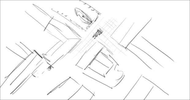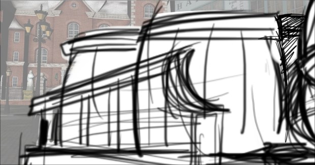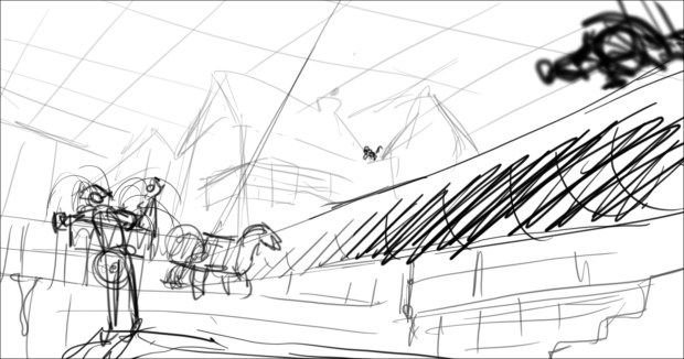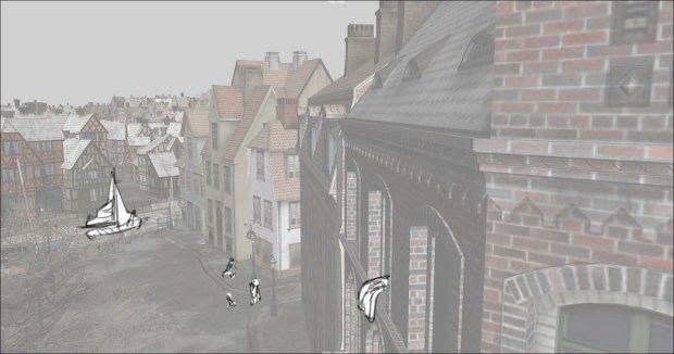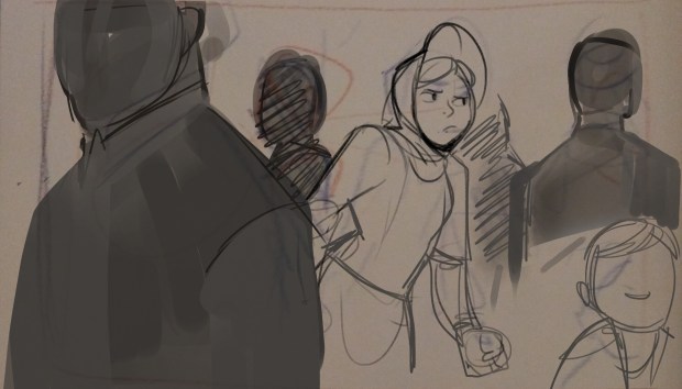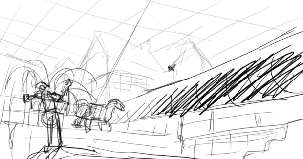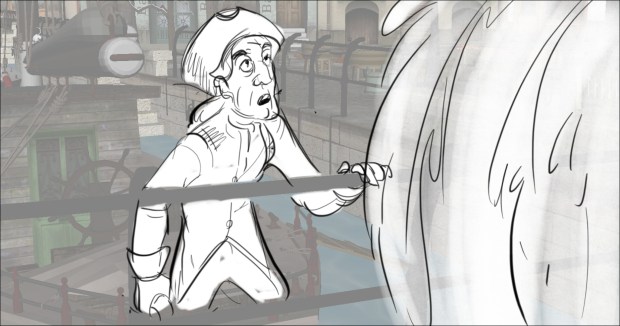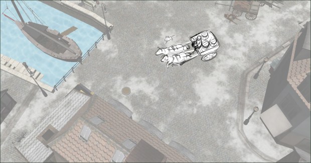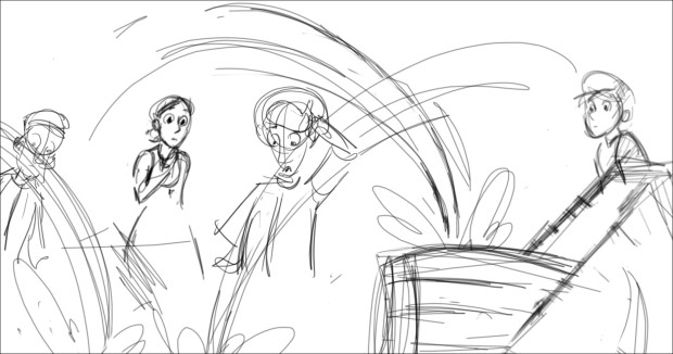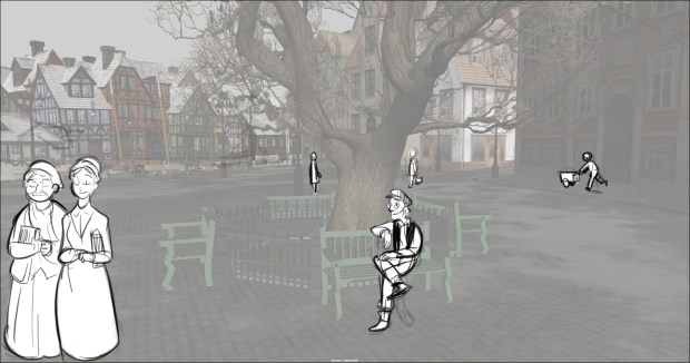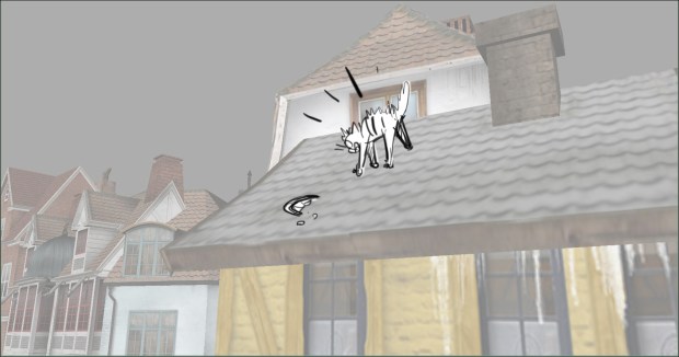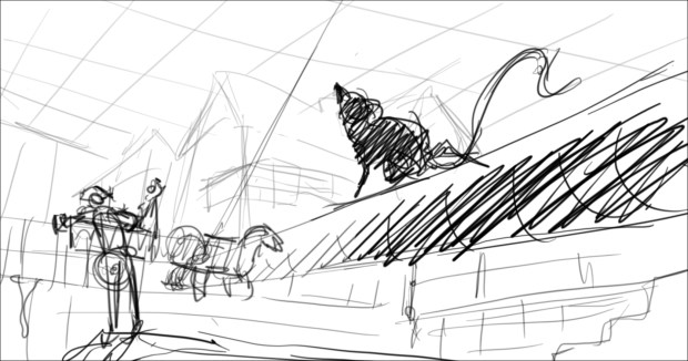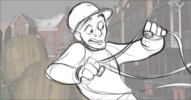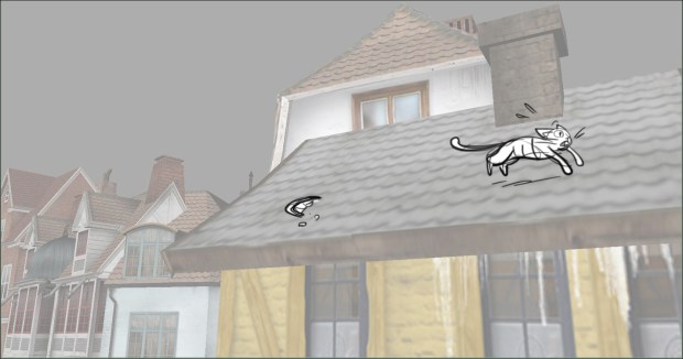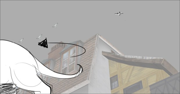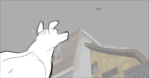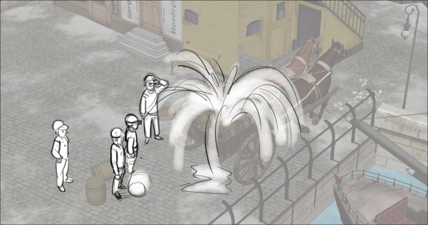 In this scene, the Snow Queen’s evil artifact, a mirror falls down from the sky into a secluded little town (resembling to Danish/Norwegian towns), The idea was to establish how the town looks, and the feeling of relative peace that the mirror disrupts eventually. Some characters got a bit more focus (like the pirate, who tries to drink from the broken barrel) since they will appear later in the story.