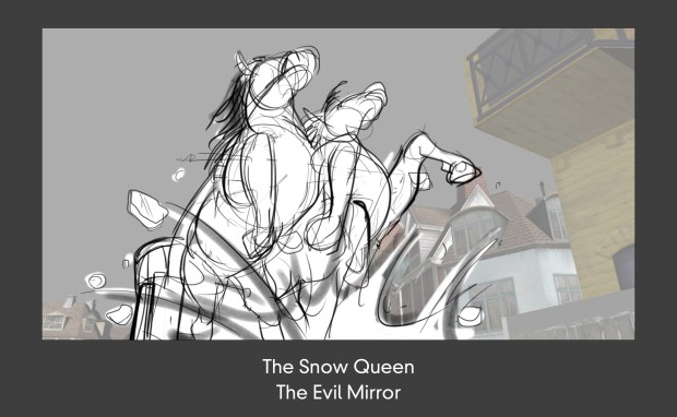Ebben a jelenetben a Hókirálynő gonosz ereklyéje, egy tükör hullik alá az égből egy félreeső kisvárosba (ami dán/norvég kisvárosokra hasonlít). A cél a helyszín körbemutatása volt, és a békés, nyugalmas életvitel érzete, amit a tükör végül megzavar. Néhány szereplő (például a kalóz, aki megpróbál inni a törött hordóból) kicsit jobban kiemelésre kerül, mivel később feltűntek még a történetben.